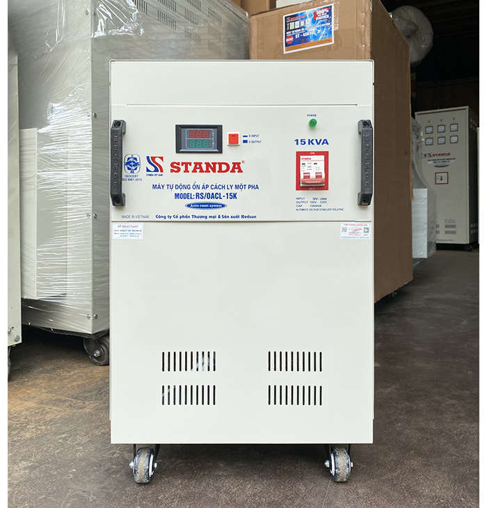 Máy ổn áp cách ly Standa 15KVA dải điện áp đầu vào 90V – 250V, khắc phục mọi tình trạng điện yếu chập chờn không ổn định.